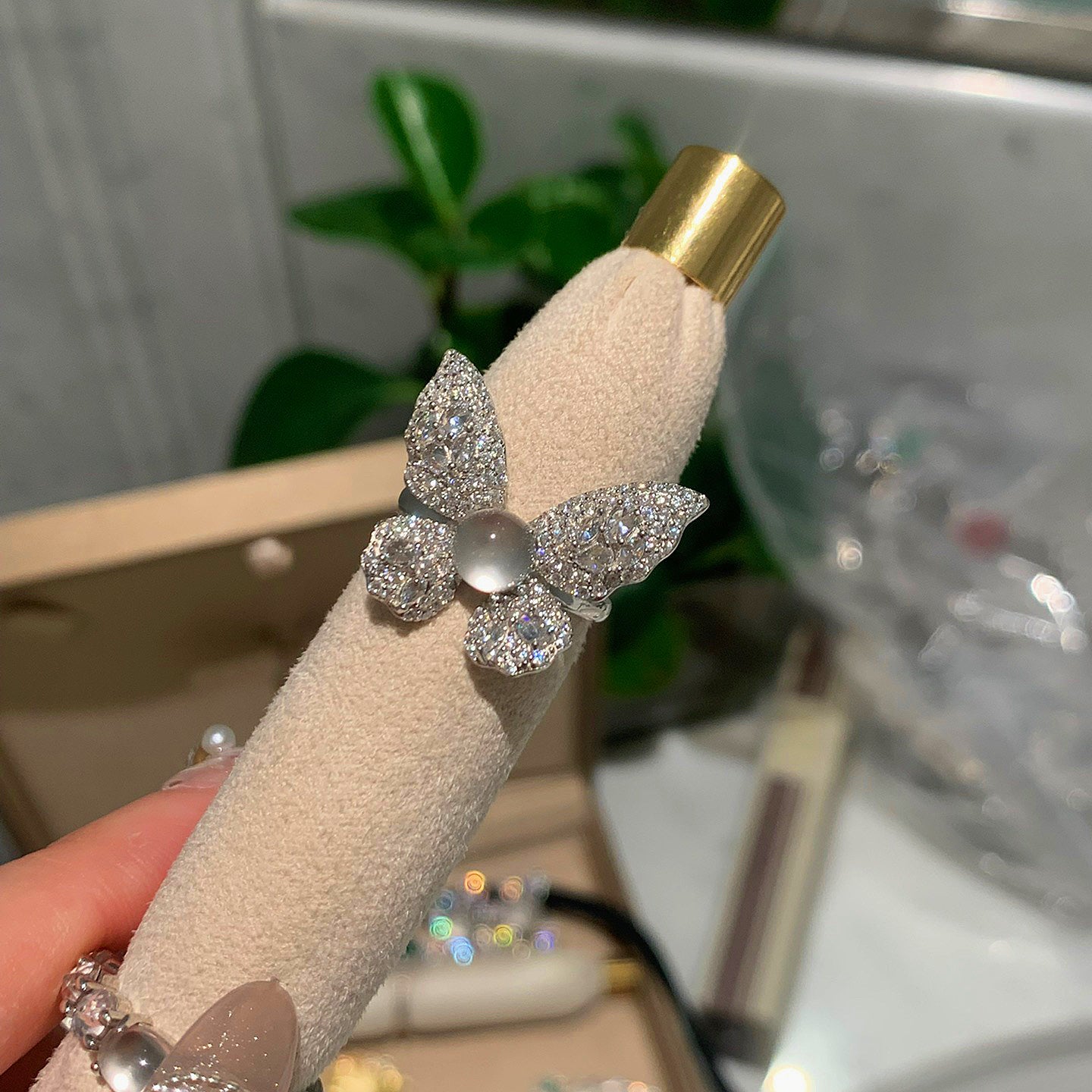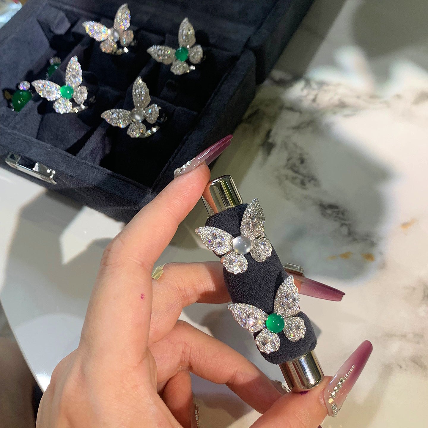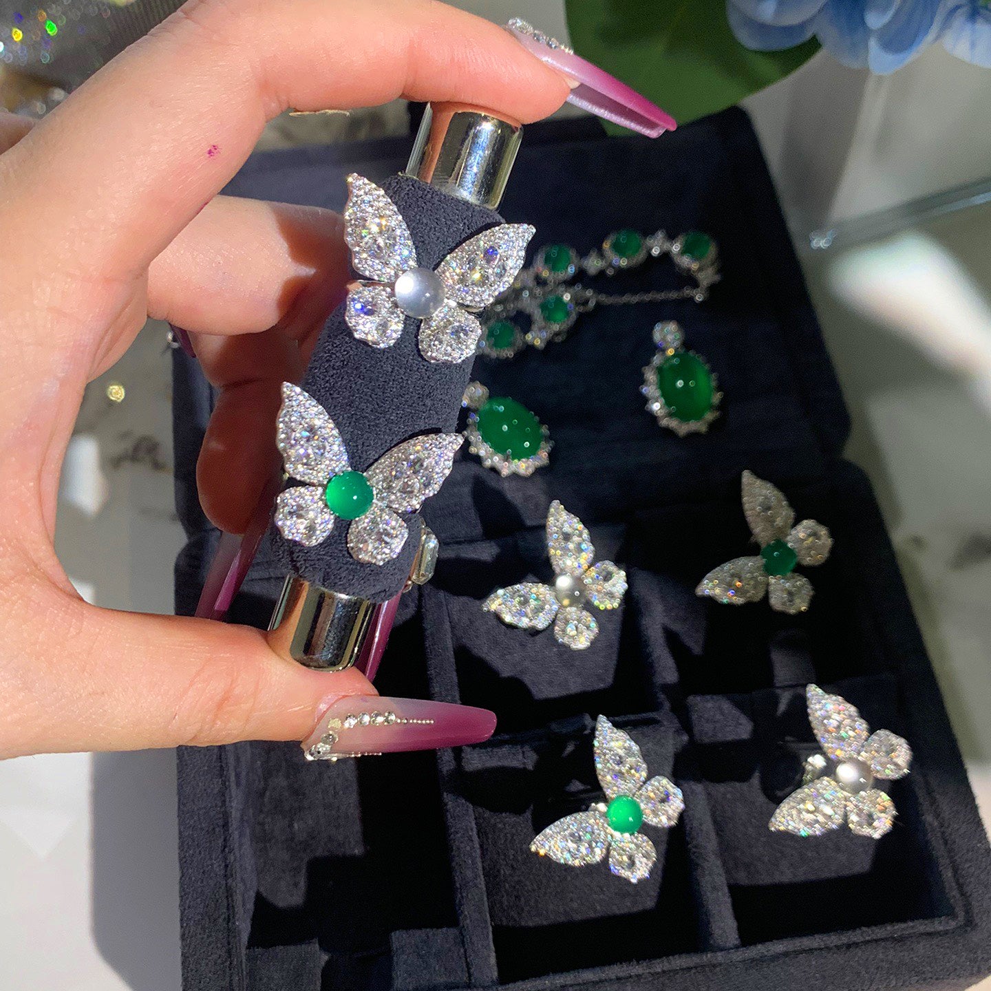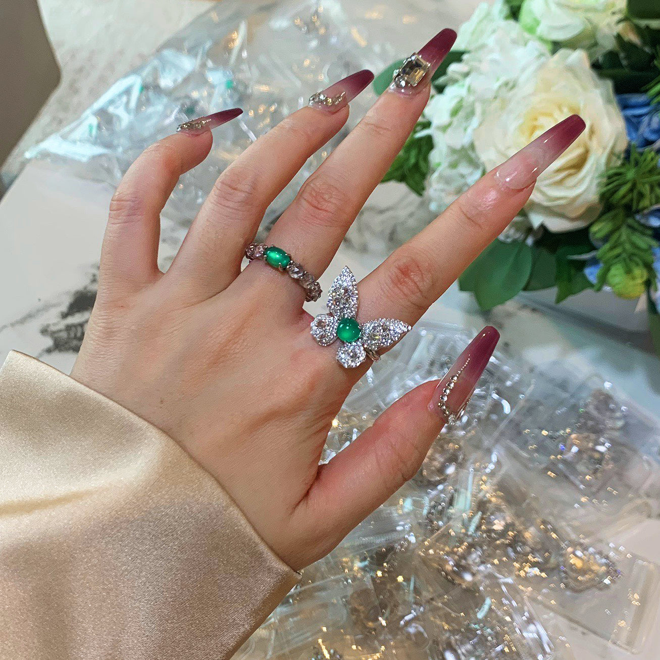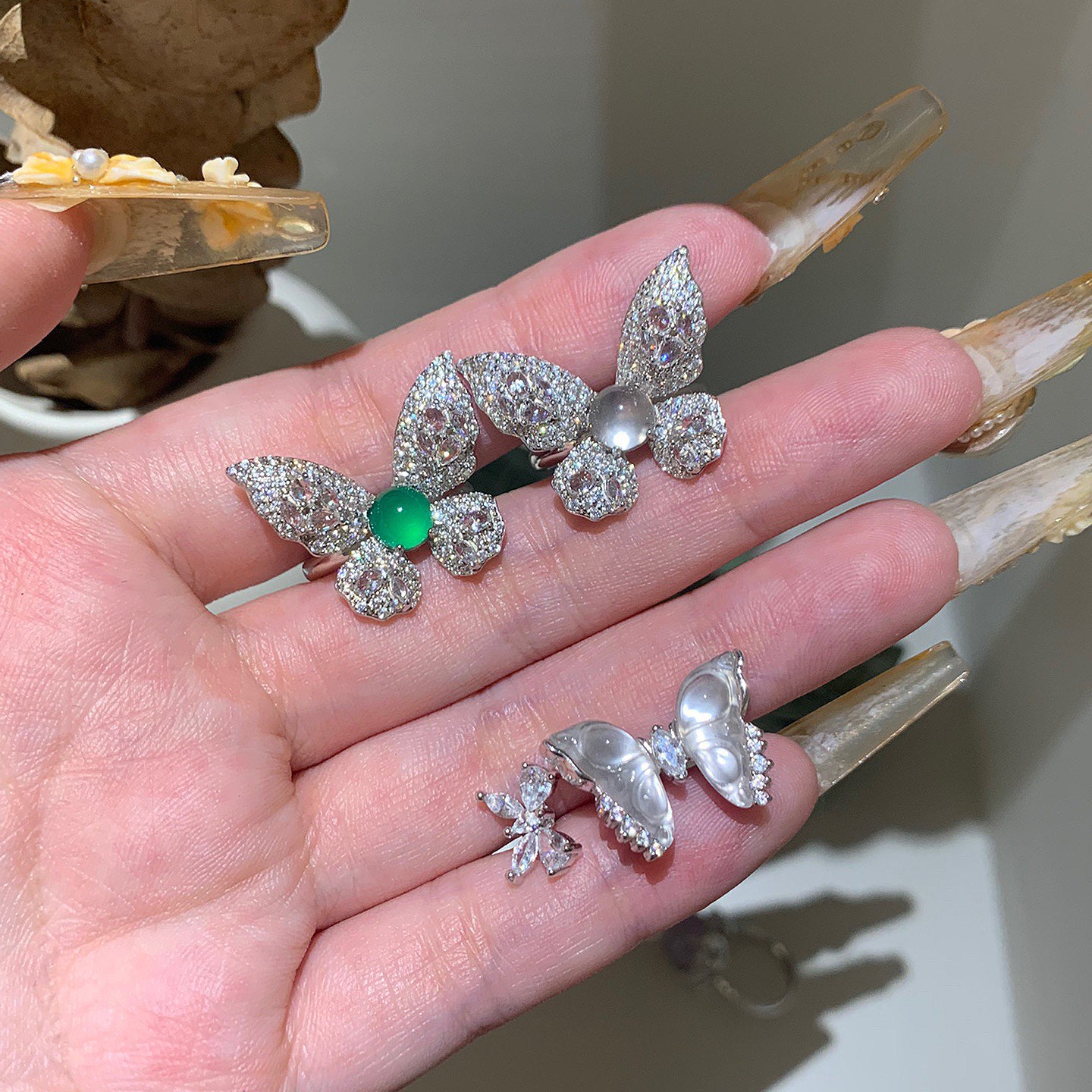 DESCRIPTION: These butterfly jade ring, carved butterfly-shaped jade stones, set in a simple and elegant silver bezel with accent rhinestones. Butterfly is considered as symbol of beauty and freedom. The special design is suitable for different clothes matching and occasions.