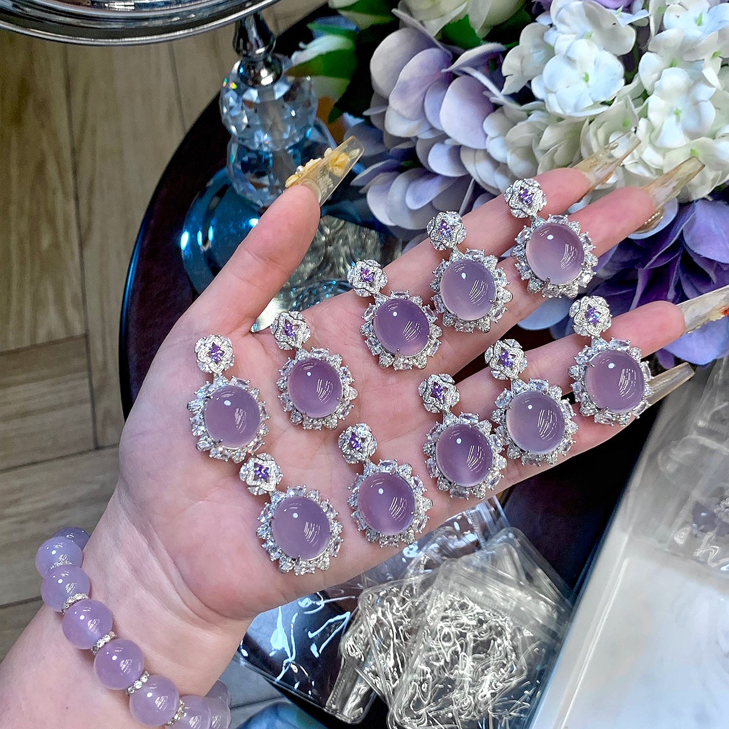 DESCRIPTION: These purple jade pendant, classic oval-shaped jade stones, set in a simple and elegant silver bezel with accent rhinestones. On the top pf the oval jade, it's a small rectangle purple crystal with a star-shaped diamond frame. Soft purple always being thought as symbols of elegance, gentle, and romance. The subtle detailing around the silver frame adds just a hint of texture, making these pendants a versatile choice for some important and formal wear. Their special design emphasizes the natural beauty of the jade, making them a refined accessory for some important and formal occasion.